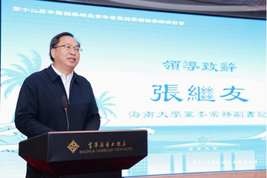张继友在致辞中表示,中华词学是中华优秀传统文化的重要组成部分,承载民族精神、传递核心价值、塑造文化认同,是传承民族文化不可或缺的载体和中华文明智慧的结晶。此次盛会群贤毕至,少长咸集,各位学者的到来,让海南岛汇聚了中华词学最前沿的思想动态。本次会议的智慧激荡不仅能深研词体艺术之美,更能从词境中提炼出连通传统与现代、沟通中国与世界的强大精神资源。